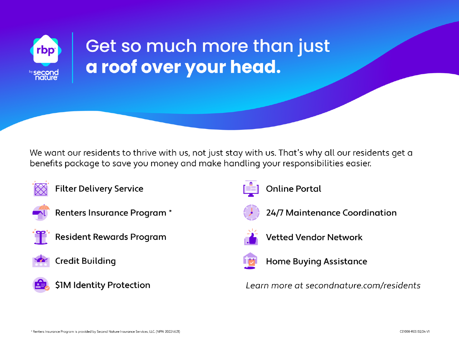 The advertised rent includes enrollment in our required Resident Benefits Package (RBP), valued at $36.95/month. The RBP includes renters insurance, credit-building services, $1M identity theft protection, HVAC air filter delivery, move-in concierge service, resident rewards, and more. Learn more at **Tenant Resources > Application and Renting Policy**.